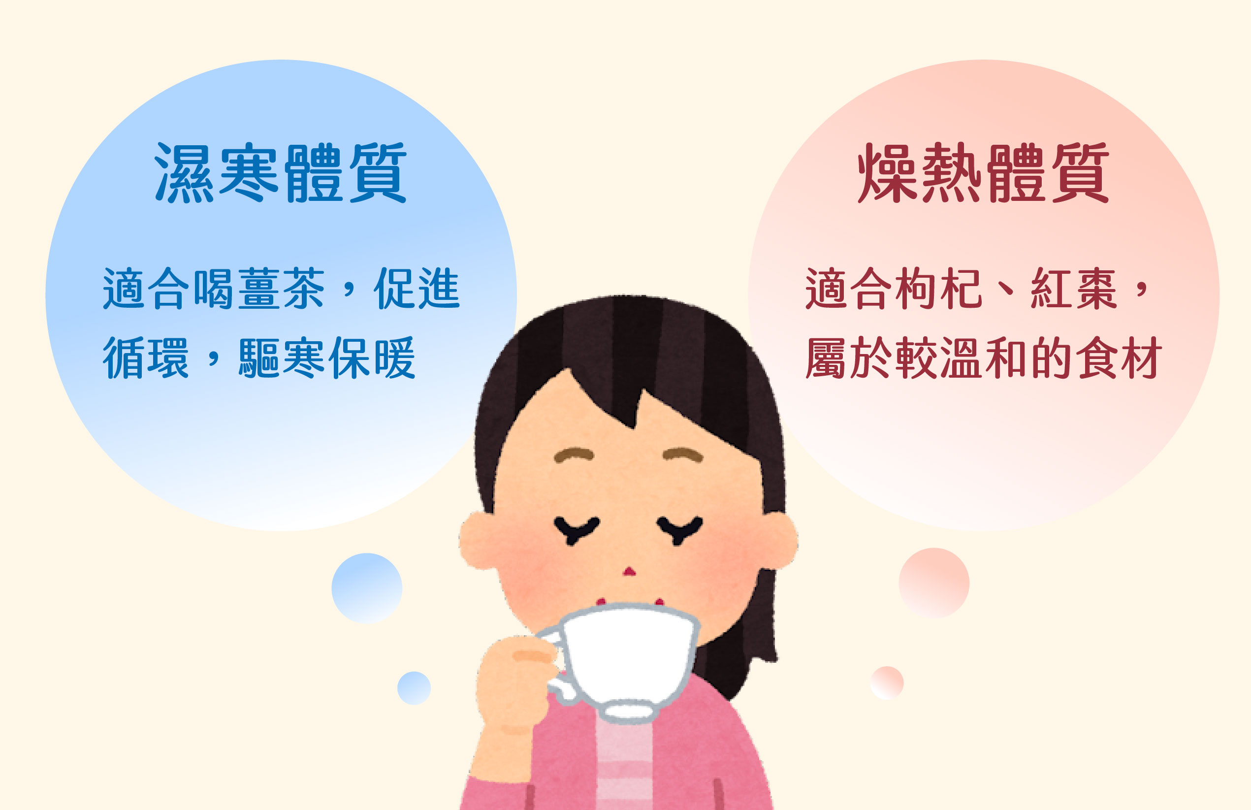A:薑茶由老薑製成,薑辣素含量高,濕寒體質喝了可以幫助體內循環,驅寒保暖。而對於燥熱體質請個人狀況依適量飲用。不論是濕寒或燥熱體質,兩種體質都很可挑選枸杞、紅棗,屬於較溫和的食材作為進補。